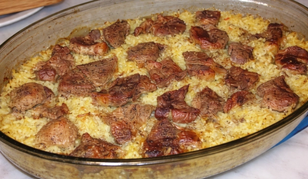 Drain the pieces of meat and put them in an oven dish. Add the rice on top, pour in vegetable broth and stir.